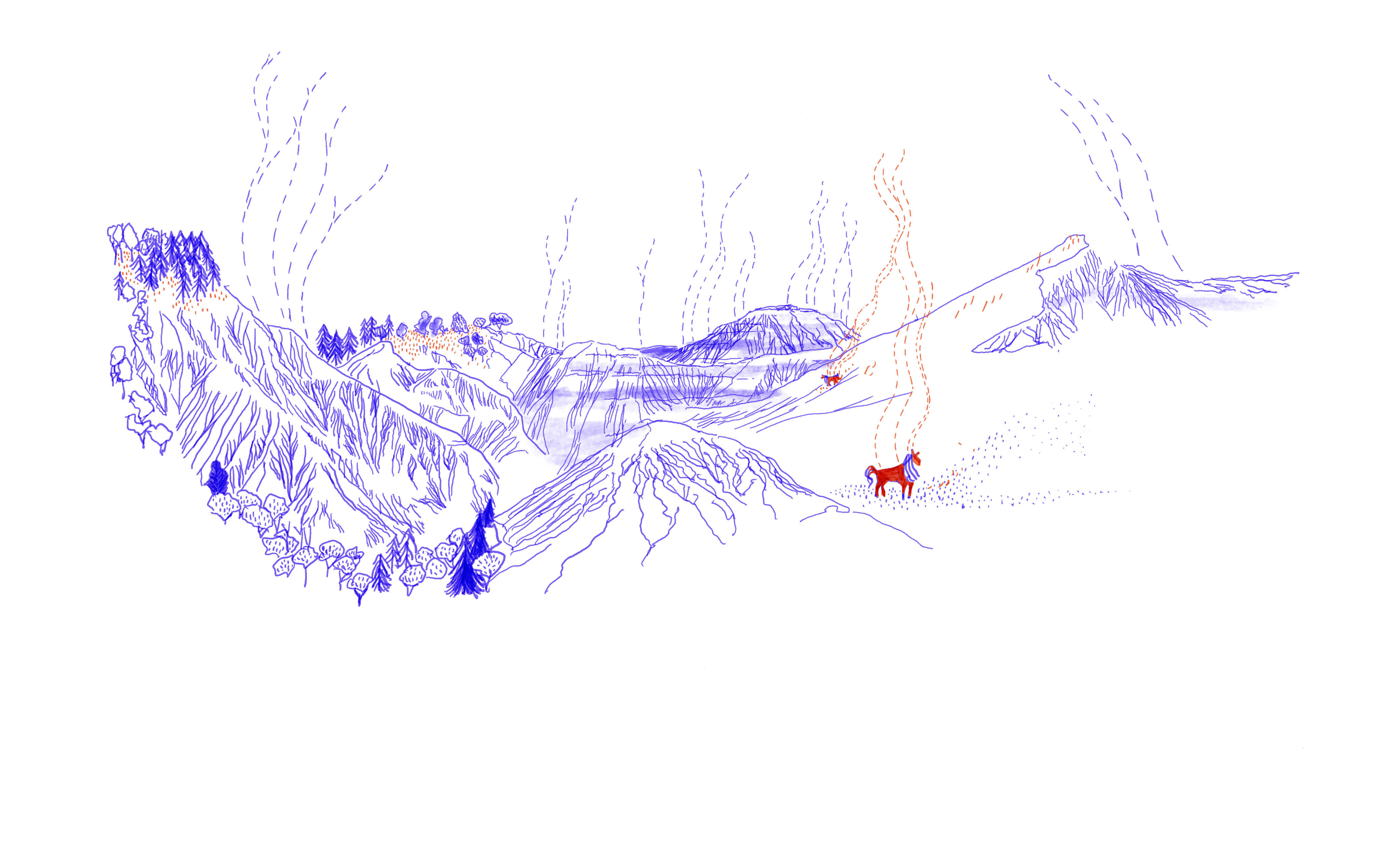 Nous nous trompons un peu de route pour rentrer. Au détour d’un itinéraire buissonnier, nous passons tout près des carrières entre le Puy et Saint-Hostien. Dans les petits canyons verts d’argile du Velay, des shetlands se rêvent en mustangs sauvages de western. Nous aussi on y croit. C’est la fin du jour, ça sent aussi le poney dans la voiture. Au passage du col, au milieu des pavillons et des hangars de la ZAC qui les jouxtent, notre monture s’éloigne dans le soleil couchant un peu comme dans une case de Lucky Luke.