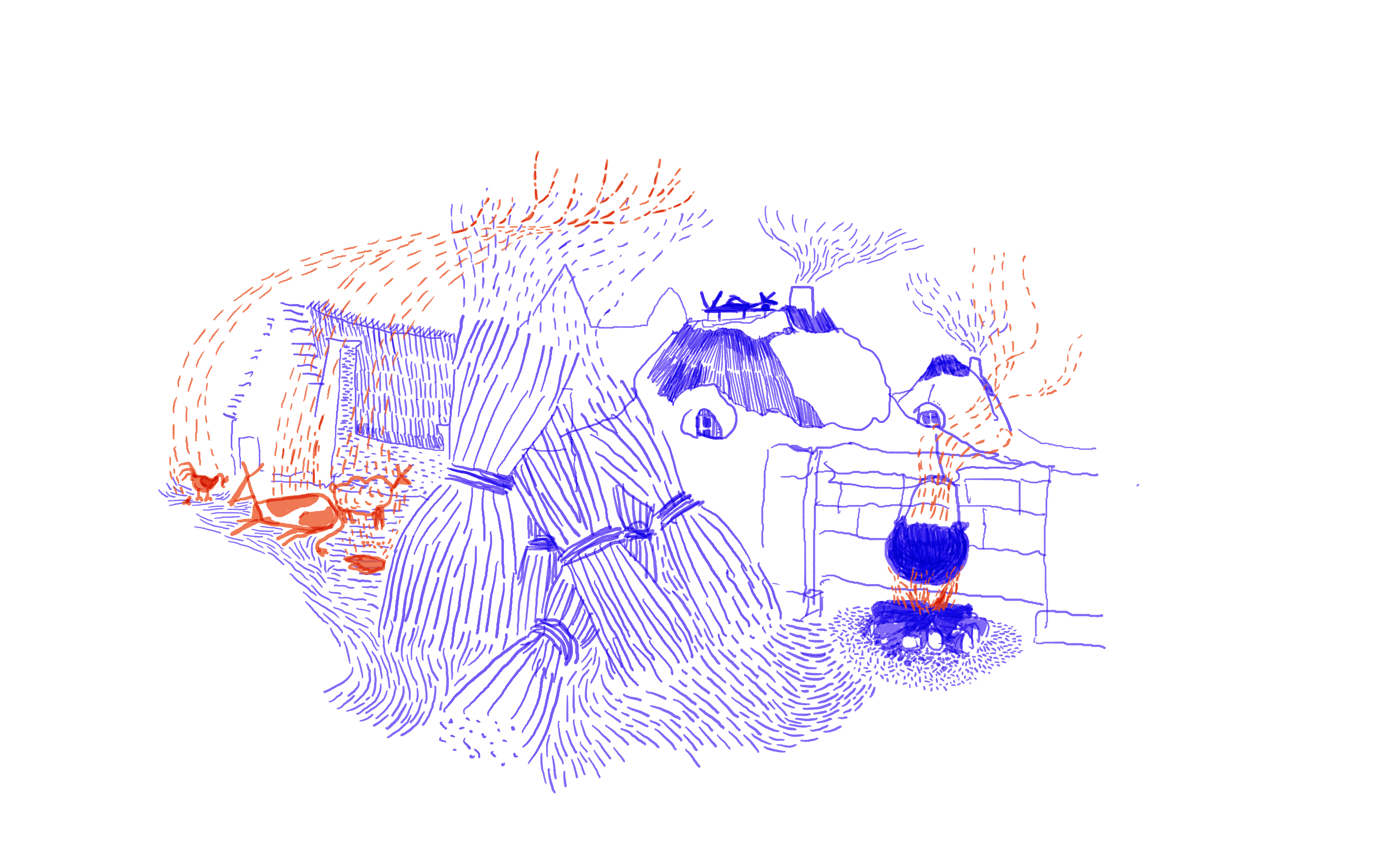 On se demande dans quelles atmosphères olfactives les contes qu’a recueillis Patrice ont pu être écoutés. Il nous raconte son expérience dans une chaumière où le feu de bois, la soupe mijotée dans une marmite suspendue à un crochet au-dessus du foyer donne une dimension toute particulière aux récits. Le bois qui brûle, la fumée qui s’en dégage comme la suie qui s’accroche aux murs de pierre forme un premier bouquet. Alliée aux exhalaisons des animaux qui vivent en membre de la famille sous le même toit que les humains de la maisonnée, la paille en jonchée ou le chaume sur la tête prennent avec l’humidité une tonalité moisie et tiède qui vient au fond soutenir ce paysage olfactif confiné des hivers d’autrefois.