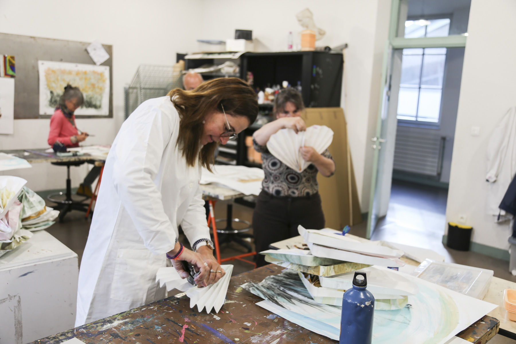 Les bénévoles de «Dis-moi où tu vis» et les élèves des Ateliers des Arts ont créé des éventails à partir d'encres naturelles à base de matières collectées pendant l'enquête. Le premier atelier a proposé une initiation à l'extraction de pigment et à leur transformation en encre. Nous avons abordé les oxydation avec les oxydes de cuivre et de fer, les encres végétales par infusion/décoction et le broyage de pigment.