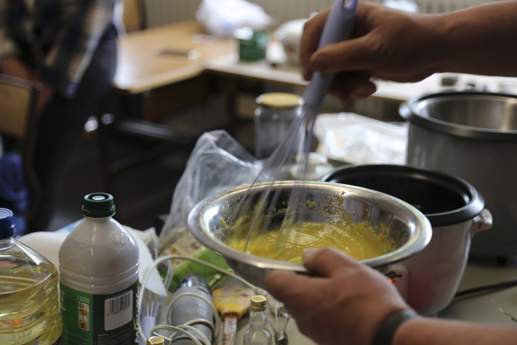 Depuis quelques années, une production est à l'étude pour fabriquer des pneus à base de pissenlits - plante de la même famille que ma roquette. Une autre odeur me revient. Dans son atelier, Kevin ouvre une peinture aérosol. Cette odeur, je la connais bien, j'en ai souvent utilisé. Bizarrement, c'est une odeur chimique d'amande amère. Il se trouve que le benzaldéhyde, utilisé comme solvant de peinture et adjuvant dans les carburants est aussi présente dans l'industrie de la pâtisserie pour donner ce gout d'amande amère si caractéristique.