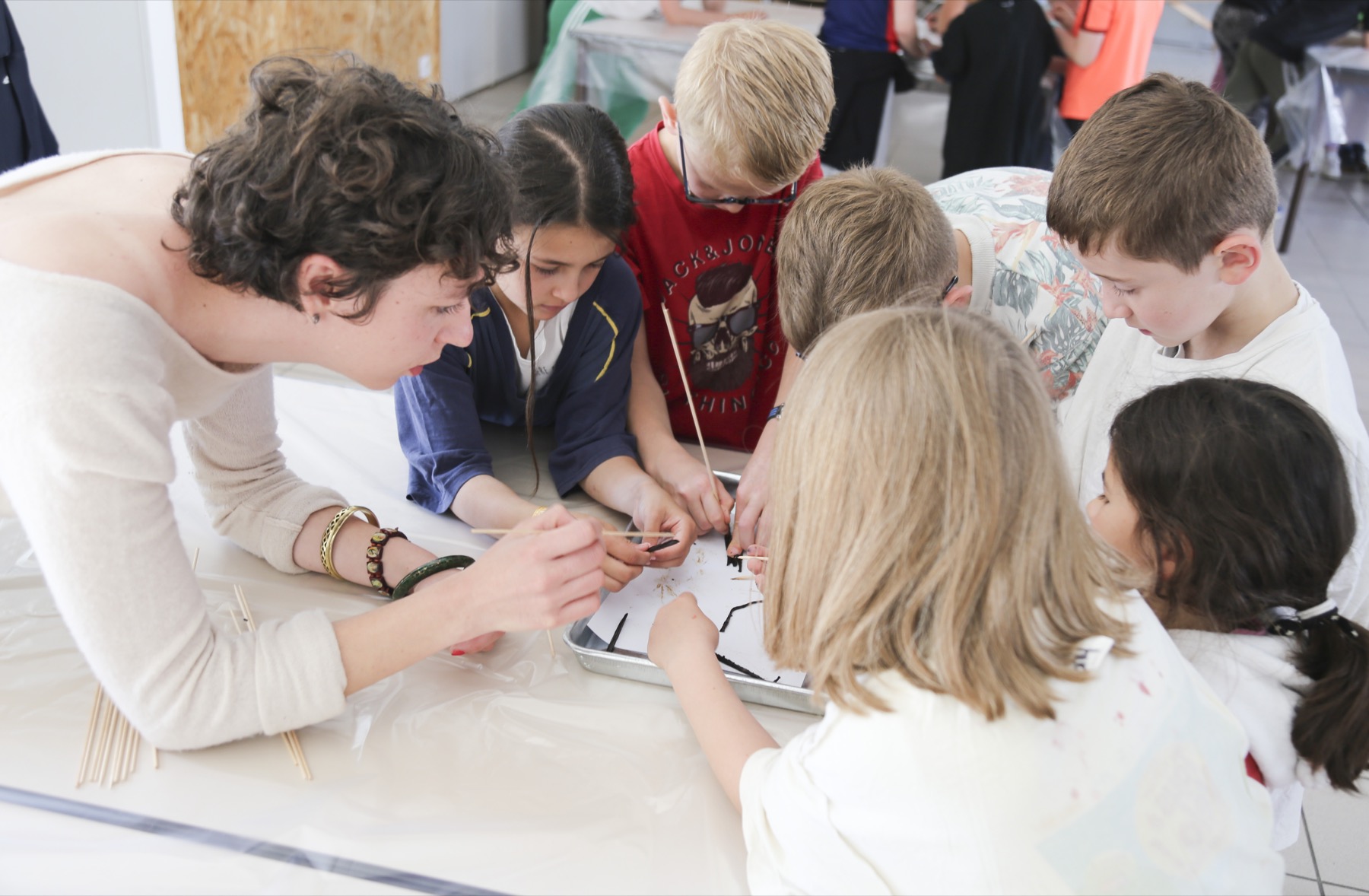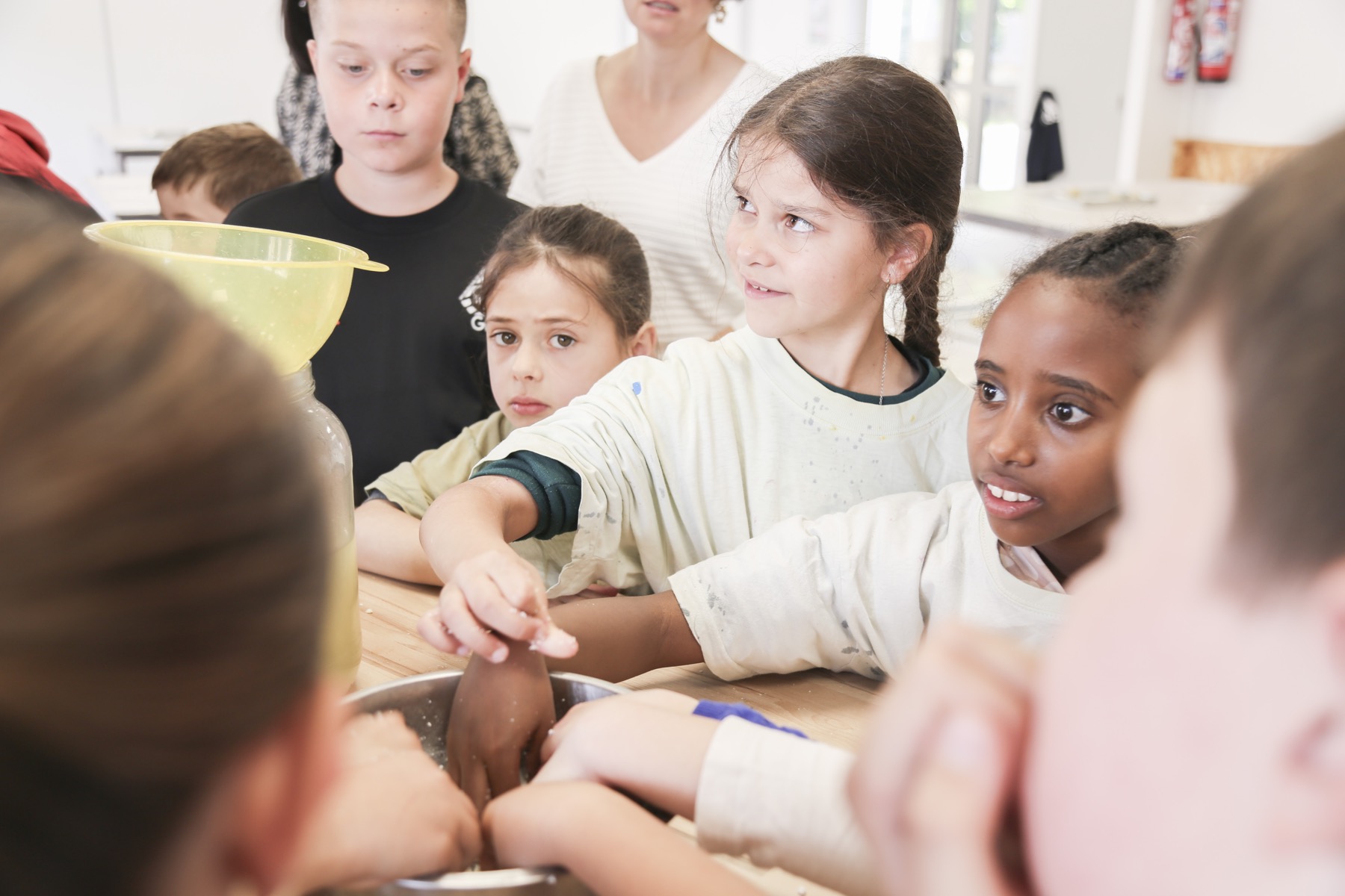 Pour commencer l'atelier, nous faisons comme Pauline, nous grattons au couteau les gousses de vanille qu'elle nous a amenées le matin même. Ensuite, nous faisons cailler du lait écrémé en le chauffant avec du vinaigre blanc et la vanille puis nous pressons le tout dans une étamine, un tissu avec des trous. La pâte ainsi obtenue nous sert à faire nos cailloux.